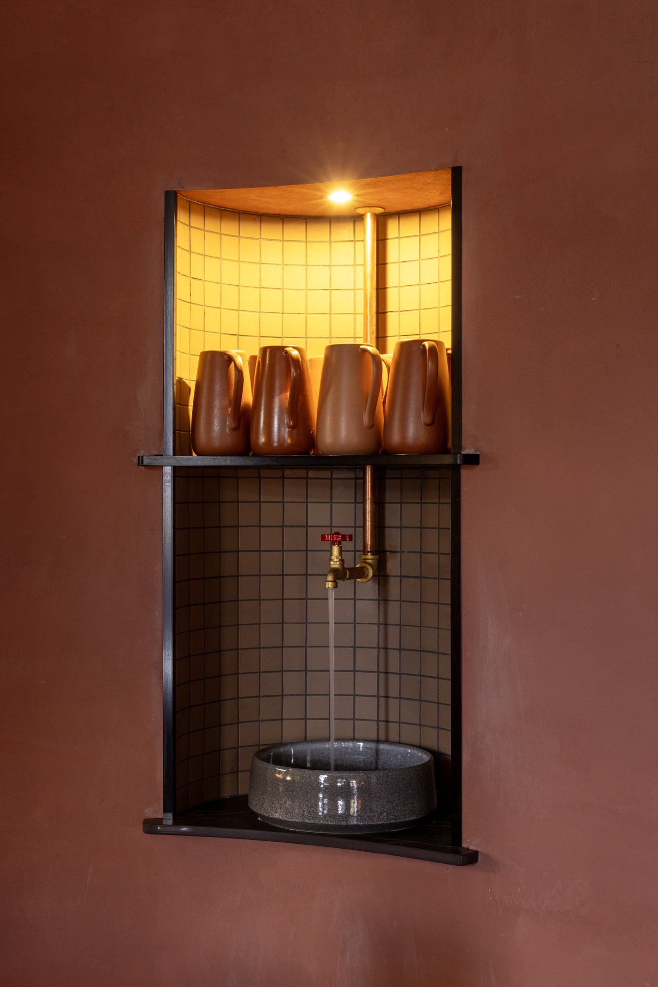 The planning of Sunfire is in relationship with the sun’s movement. The dining space is at the front of the building and outdoors, in the morning sun. Intimate booth dining spaces are a touch further into the space where the closeness of people replaces the warmth of the sun. Deeper still into the space are high dining tables and in the darkest corner is the bar - glowing with amber toned lights and citrus glazed tiles. The famous Josper (charcoal oven) is visible through a long slot opening in the kitchen wall, interrupted by crockery shelves and very special ceramic pieces in dedicated shelves.